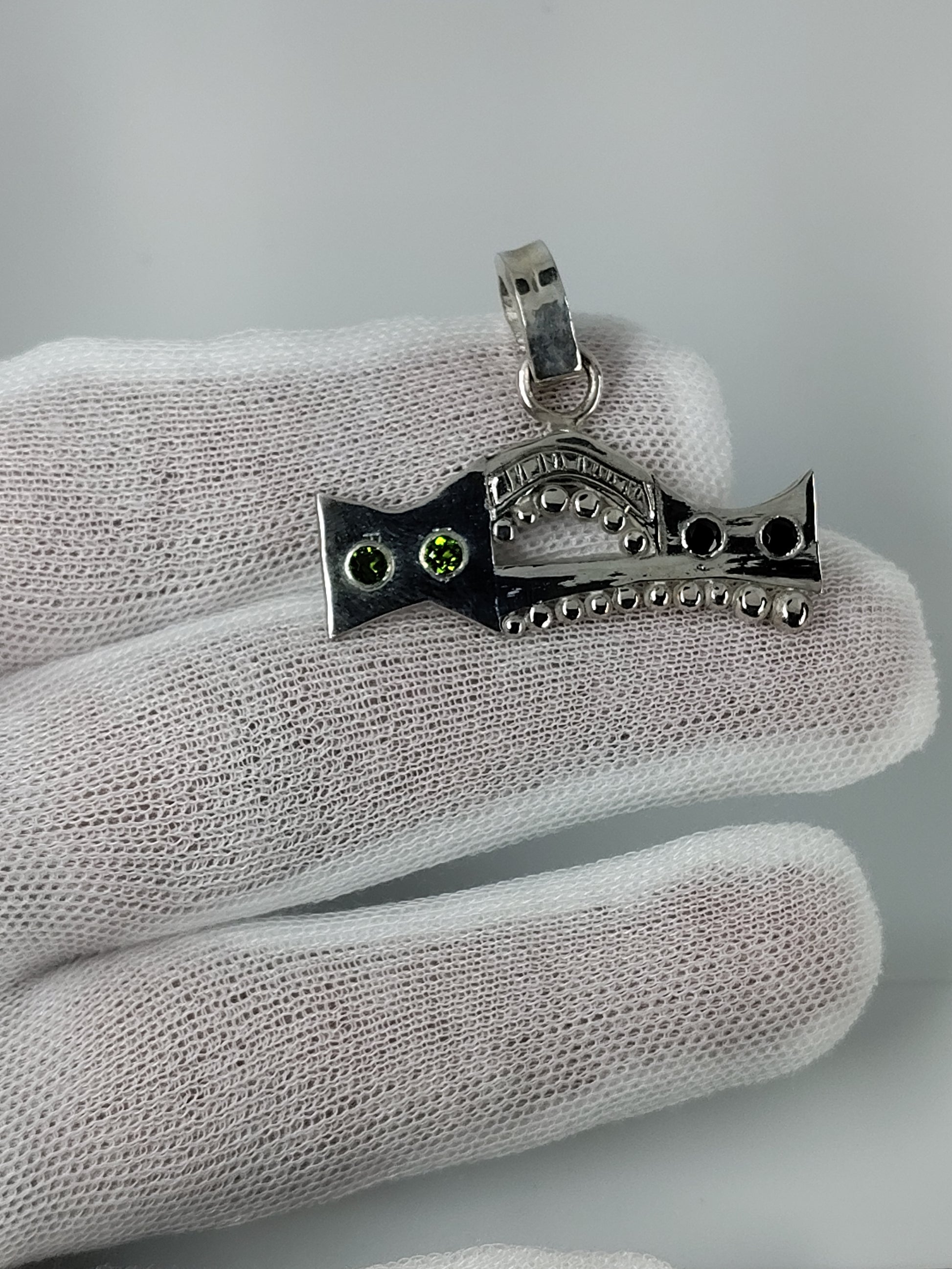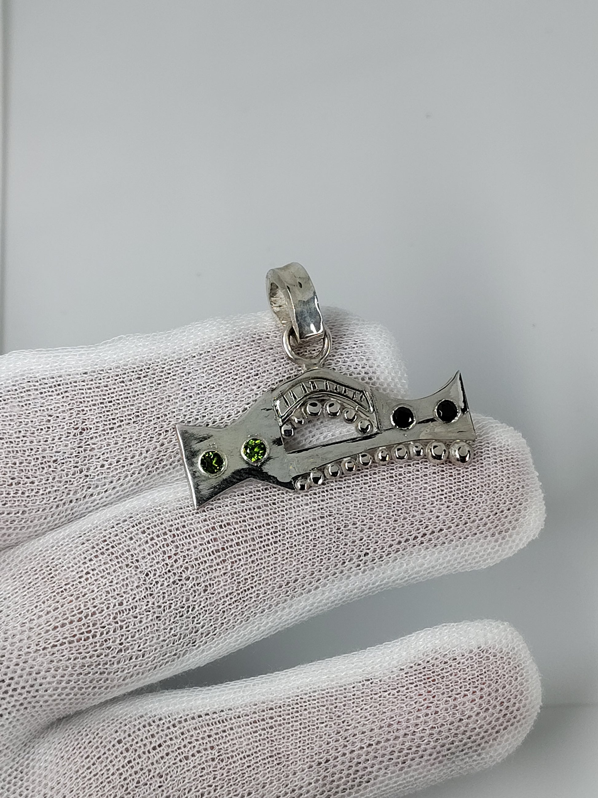 This singular creation combines two vivid chrome diopside stones with black spinel, meticulously set in .940 argentium silver. The geometric, sculptural form is engineered with a precision-designed bail that enables the pendant to hang in perfect equilibrium, allowing light to refract across its surfaces from multiple angles. Hand-torched fabrication ensures each piece remains authentically unique, embodying deliberate craftsmanship and contemporary metalwork aesthetics.e