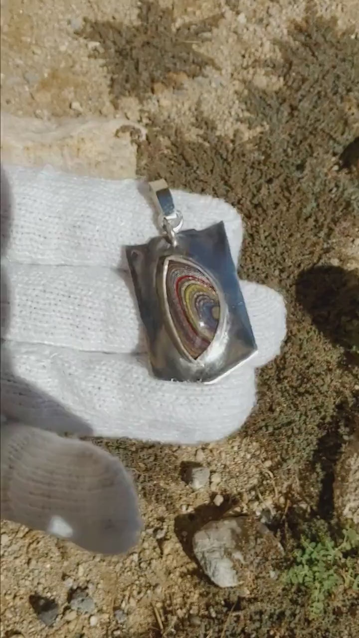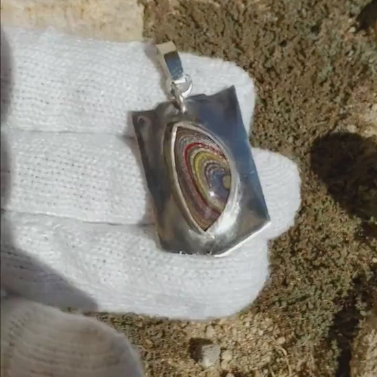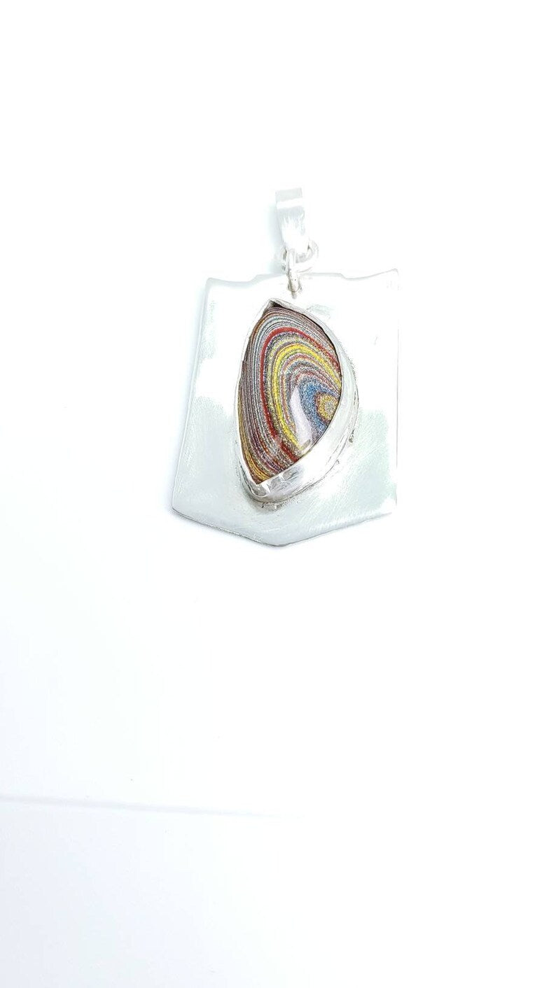 This Fordite Pendant features a unique blend of colors and patterns from the 1978 Chevrolet Corvette paint slabs. Handmade with Argentium silver .935, this pendant offers a one-of-a-kind look for automotive enthusiasts. Channeling the iconic hood shape of the Corvette Stingray, this piece is a great addition for both car enthusiasts & jewelry lovers.