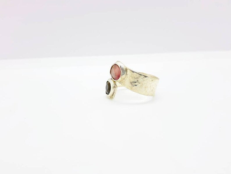 Handcrafted with care, this watermelon Tourmaline ring boasts two gorgeous faceted stones - one pink, one green - totaling 3 carats. The Argentium silver band, measuring 4mm in width, adds a touch of elegance and is hand-textured for a unique finish. Available in size 8.